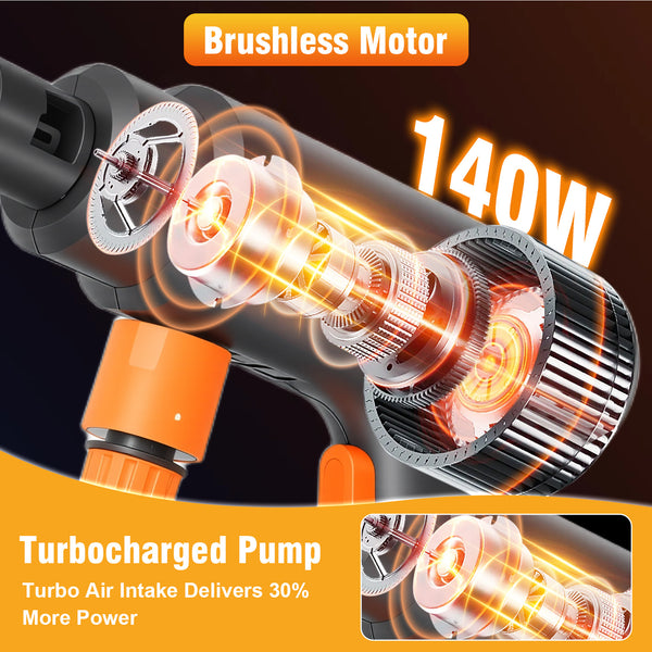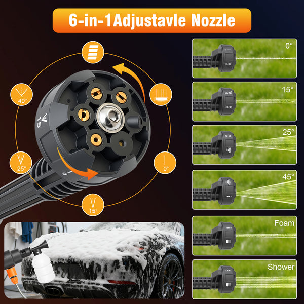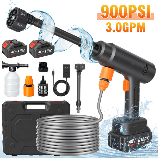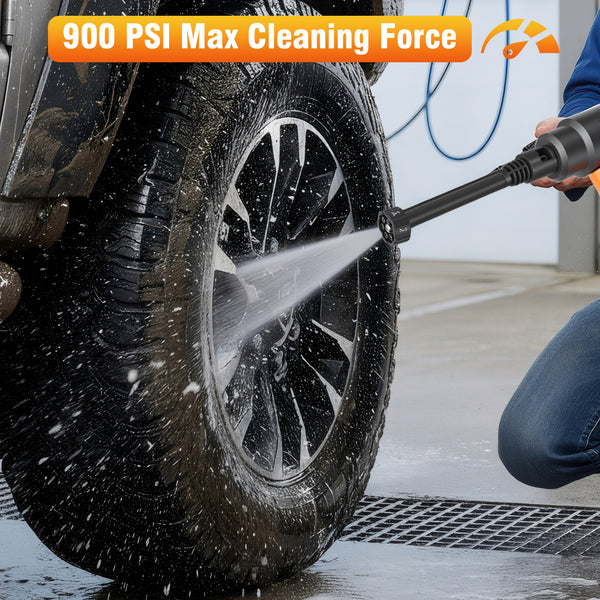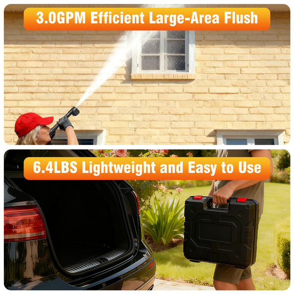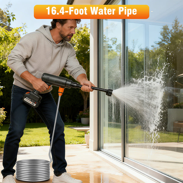 Meet your new cleaning companion! This 21V cordless pressure washer delivers powerful 900 PSI water pressure and 3L/min flow rate, blasting away stubborn dirt from cars, patios, fences, and outdoor furniture with ease. The 6-in-1 adjustable nozzle lets you switch between zero-degree precision jet and gentle shower modes in seconds. No cords, no hassle - just attach the included 4.0Ah battery and water source, and you're ready to go! Lightweight and ergonomic, it comes with a handy storage case for easy portability. Perfect for quick cleanups around the house, garden, or garage.