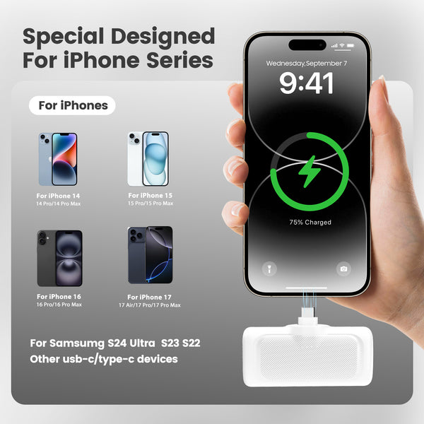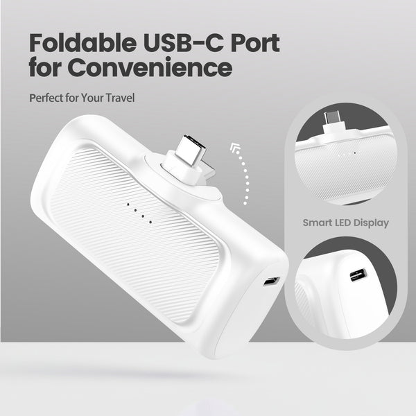 This USB-C power bank comes with a built-in foldable plug¡ªsimply unfold it, and you¡¯re all set for super-fast charging! With dual ports offering up to 22.5W of power, it juices up your phone to 50% in a mere 30 minutes. Plus, its 5000mAh battery keeps going all day long, making it perfect for travel and daily use. It¡¯s simple, smart, and always there when you need a boost!