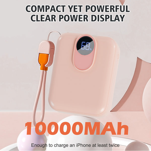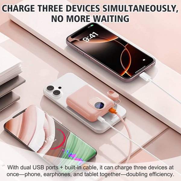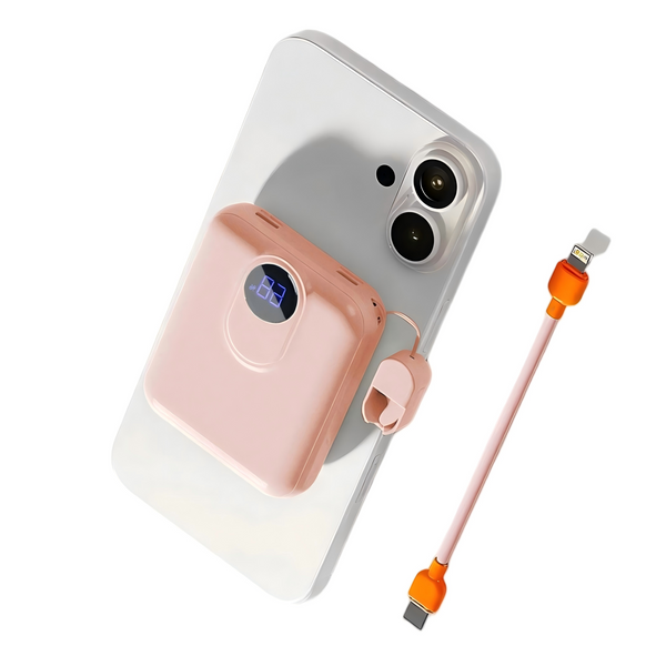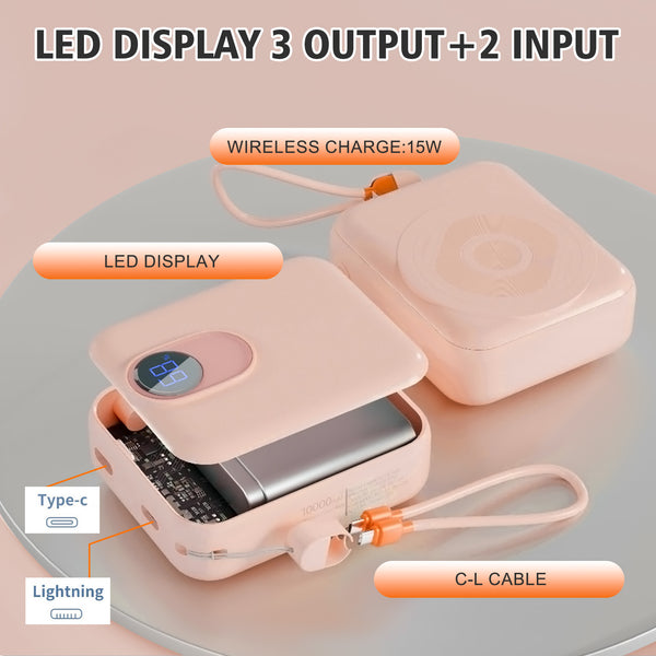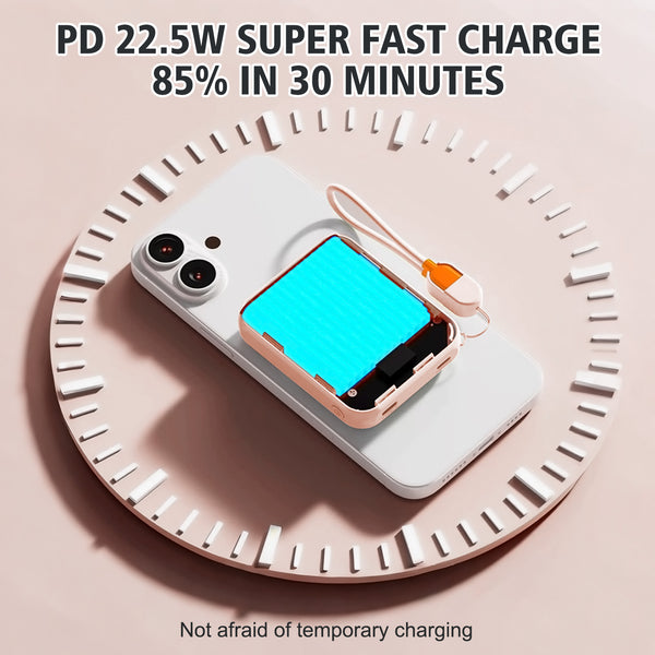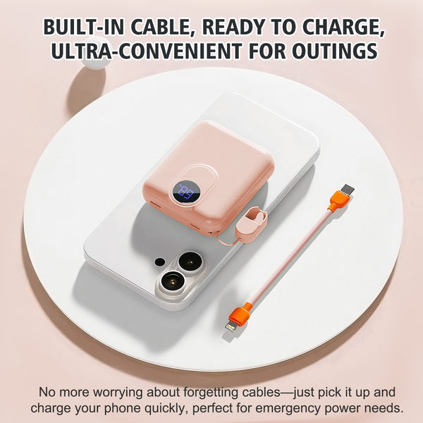 This magnetic power bank redefines portable charging.Featuring an innovative detachable built in cable design, it is ready to use anytime, eliminating the hassle of forgetting charging cables.