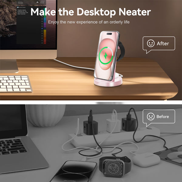 Tired of messy charging cables cluttering up your tidy desk? Our 3-in-1 magnetic charging station is the game-changer you¡¯ve been waiting for. It delivers a powerful 15W charge and works seamlessly even with your phone case on. Safety is our top priority¡ªwe¡¯ve built in premium overcharge protection. Plus, the soft LED indicator glows gently to show charging progress, so it never disturbs your sleep.
