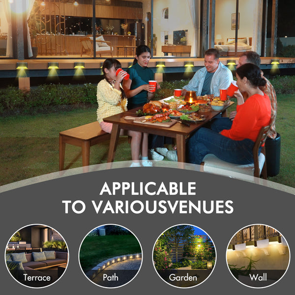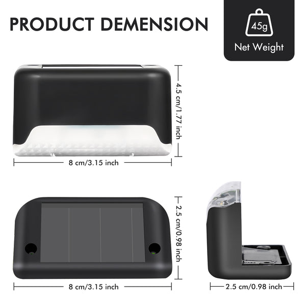 ??Widely Use & Multipurpose -- The included screws and glues make it possible to place the lights in a variety of outdoor locations, providing a versatile option for both lighting and darden decoration purposes. Whether placed on stairs, steps, decks, or along outdoor walls, these step lights solar powered effectively light up your front door, patio, yard, garden, driveway, or other outdoor decor.