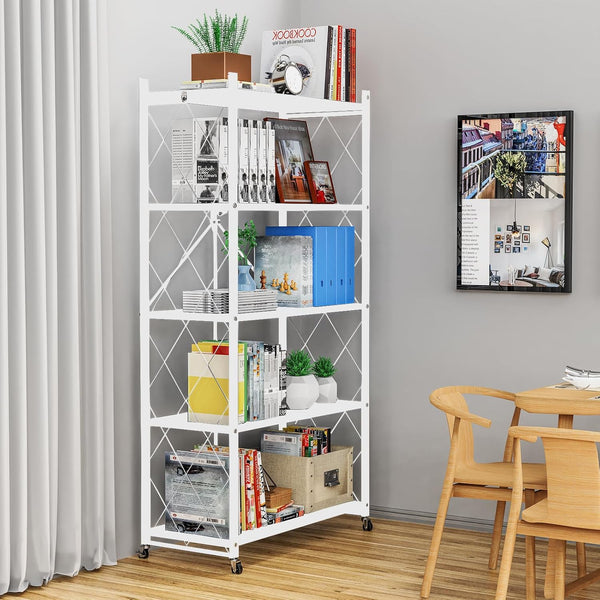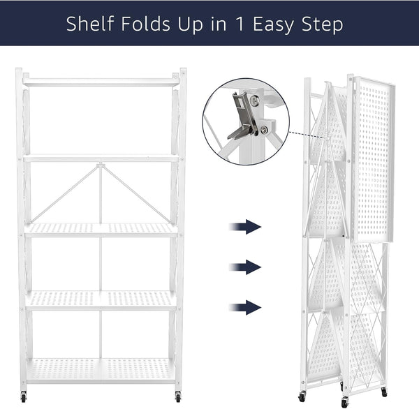5 Tier Foldable Storage Shelves with Wheels, Large Capacity Shelving Unit, Freestanding Metal Wire Shelf Rack, No Assembly Organizer Rack for Garage Kitchen, Basement, Pantry(White)