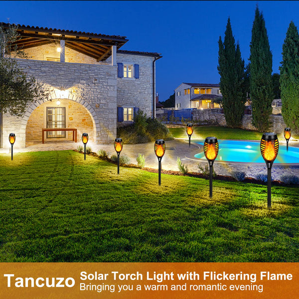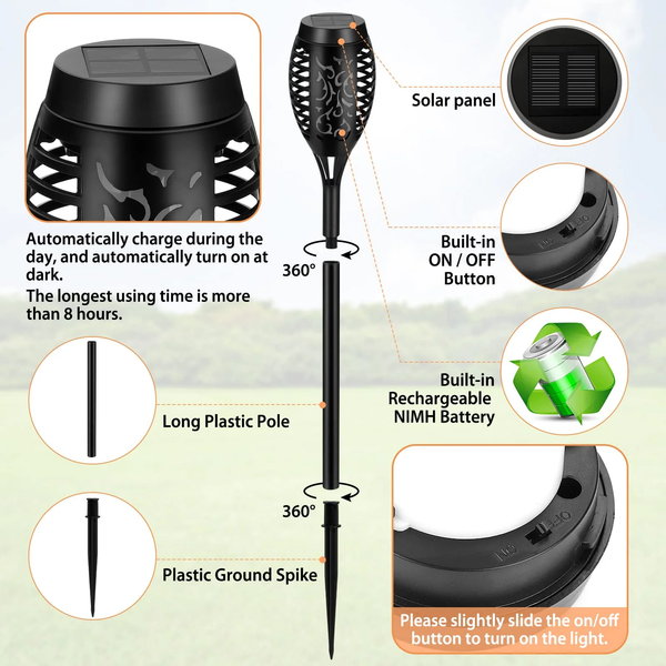 - Weatherproof & Durable:The flickering outdoor lights are made of high quality and durable IP65 Waterproof ABS material, thus withstanding all kinds of weather, allowing you to enjoy the dancing flames all around the year. That is why our solar powered torch lights are perfect for outdoor use, acting as a beautiful decoration lighting for your garden, pathway, driveway, backyard, etc.