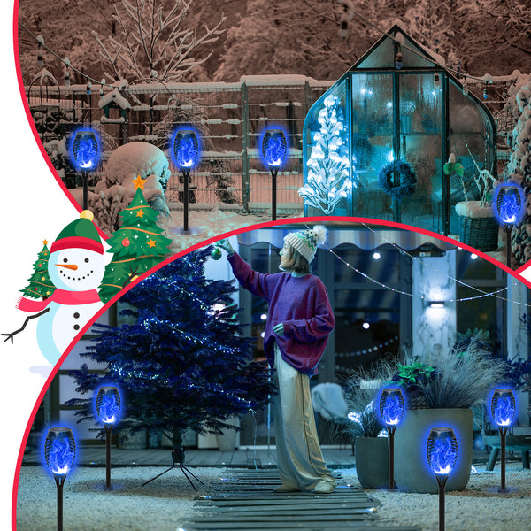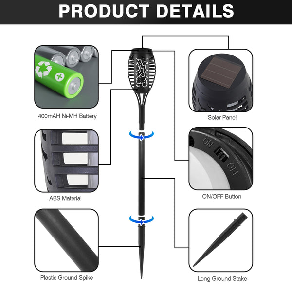 • Easy Installation & Auto On/Off: Solar powered outdoor lights no wiring required, place the outdoor lights on your Lawn, Garden, Flower Bed, Yard, Patio, and Pathways, creating festival atmosphere for H-alloween and Christmas. No electric need; environmentally friendly tiki torches for outside support Auto ON/OFF switch from Dusk to Dawn.