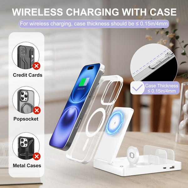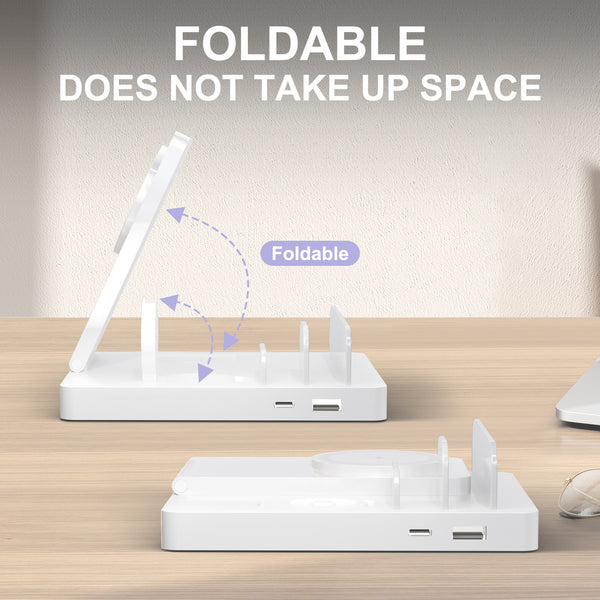 Meet our 5-in-1 magnetic wireless charger¡ªyour all-in-one charging answer. Measuring 5.91¡Á5.12¡Á1.85 inches and crafted from sturdy materials, it fits perfectly at home, office, or in your travel bag. Magnetic alignment lets it wirelessly charge your phone, earbuds, and smartwatch (no messy cables), plus two USB ports power a tablet and extra phone simultaneously, keeping your space tidy. It works seamlessly with most Qi-compatible devices.